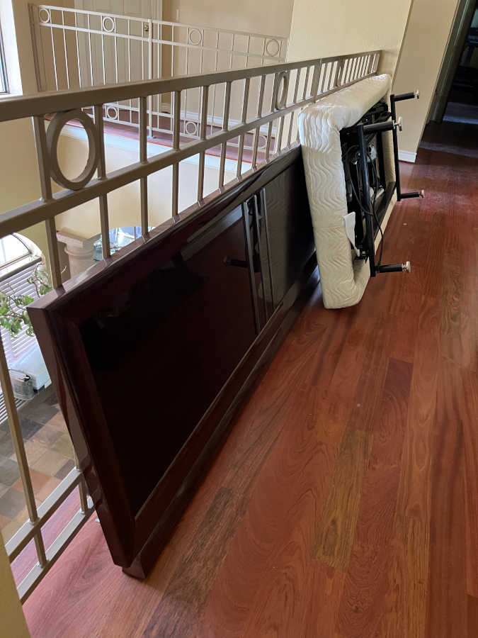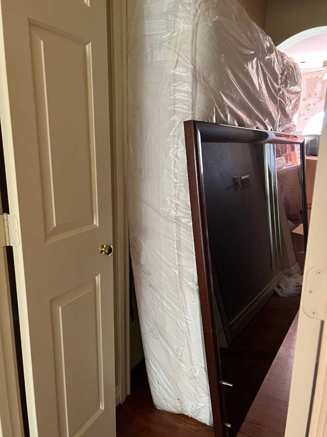 Note: Because of an ongoing floor issue there was nowhere to move the parts of the bed that blocked the door.